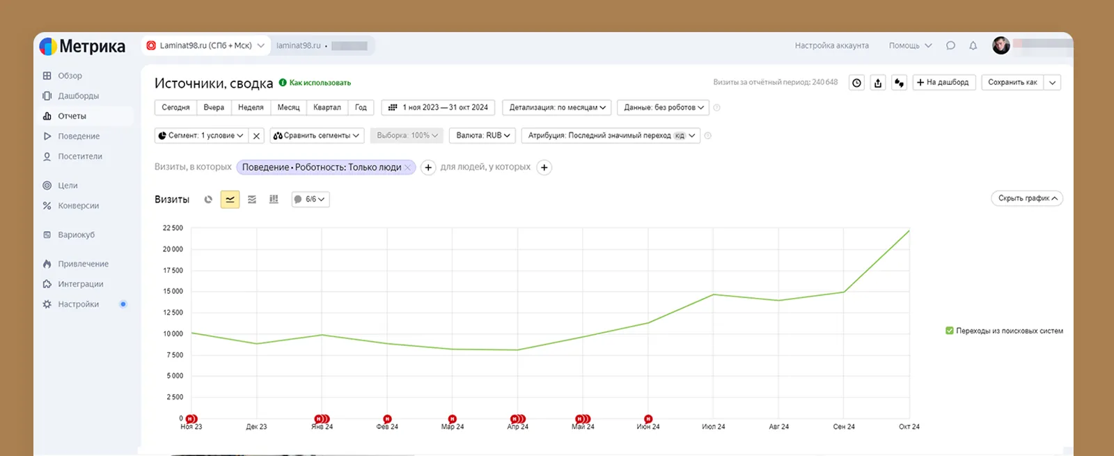 После доработки блога и начала периодической публикации статей мы достигли значительного увеличения информационного трафика. Это позволило привлечь новых посетителей, заинтересованных в полезных материалах о напольных покрытиях, и способствовало повышению узнаваемости бренда «Ламинат 98» среди потенциальных клиентов.