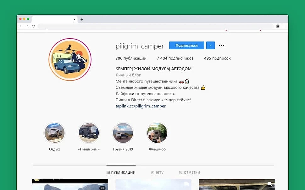 Так же сделана рекламная компания в соцсети Инстаграм для наполнения группы и увеличения узнаваемости бренда Пилигрим-Кемпер.